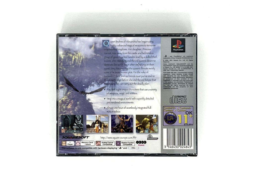 Final Fantasy IX je posledním dílem epické ságy japonských RPG, který vyšel pro první PlayStation. Svým stylem se FF9 vrací ke kořenům série, aniž by slevila ze své grafické laťky. Děj se točí kolem skupiny divadelních herců vedených mladíkem Zidanem, kteří si přivydělávají jako zloději. Když se zapletou do mocenské hry královny země Alexandria, a skončí s její dcerou, princeznou Garnet, jako rukojmím, zjistí, že ve hře je mnohem víc, než si zpočátku dokázali představit.