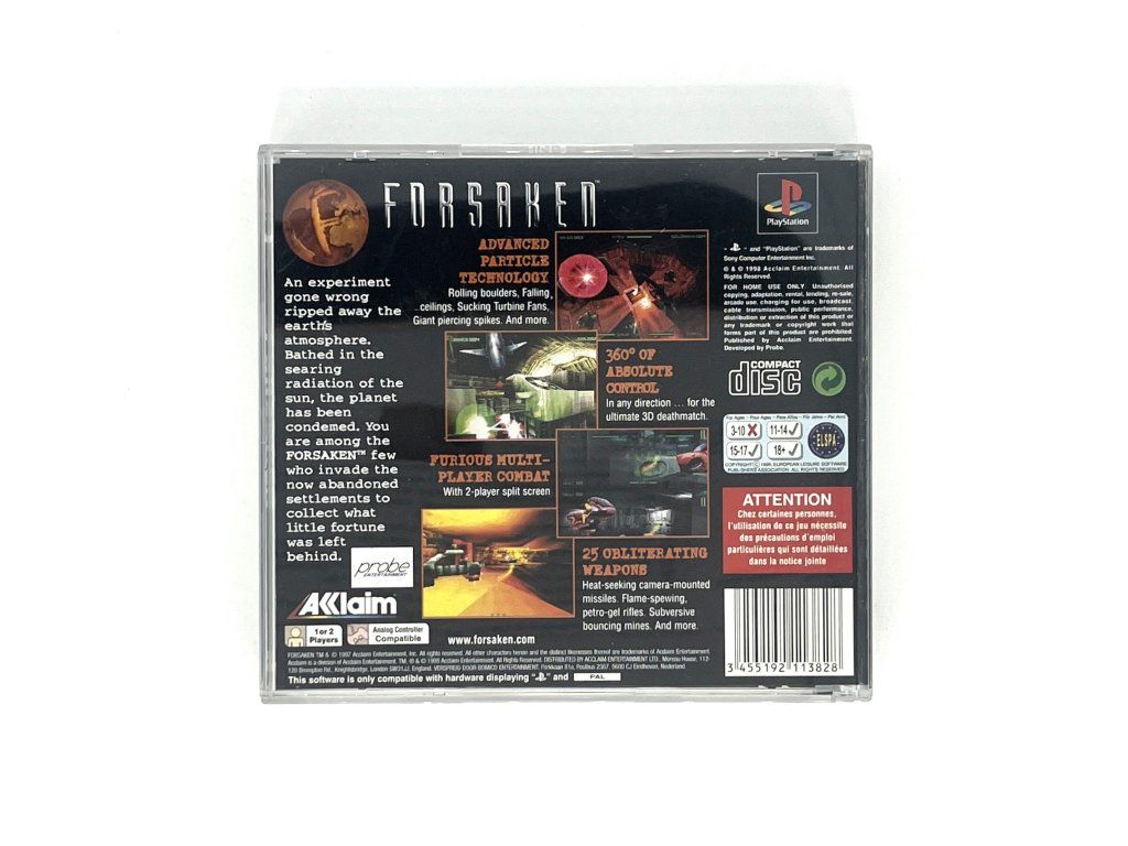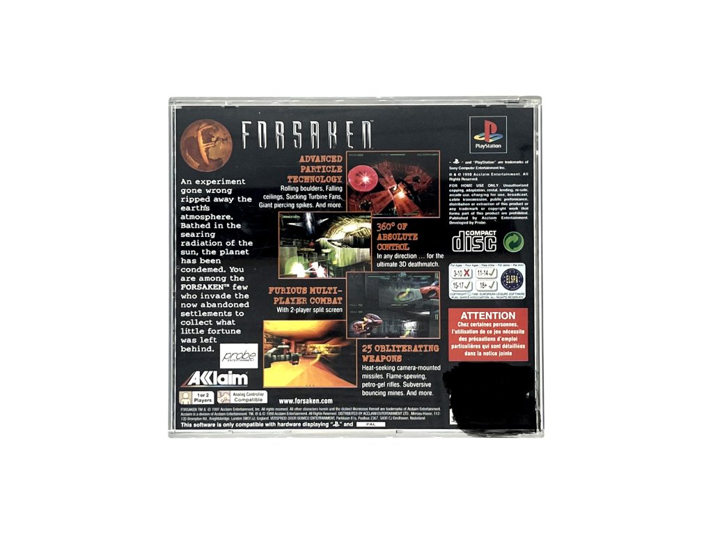 Forsaken pro PlayStation 1 přináší rychlou akci v futuristických 3D arénách. Ovládej plovoucí bojová vozidla, sbírej zbraně a power-upy a bojuj proti protivníkům v náročných soubojích plných překážek a nebezpečí. Hra kombinuje intenzivní hratelnost, strategické využívání vybavení a akční momenty, které prověří reflexy i taktické schopnosti.