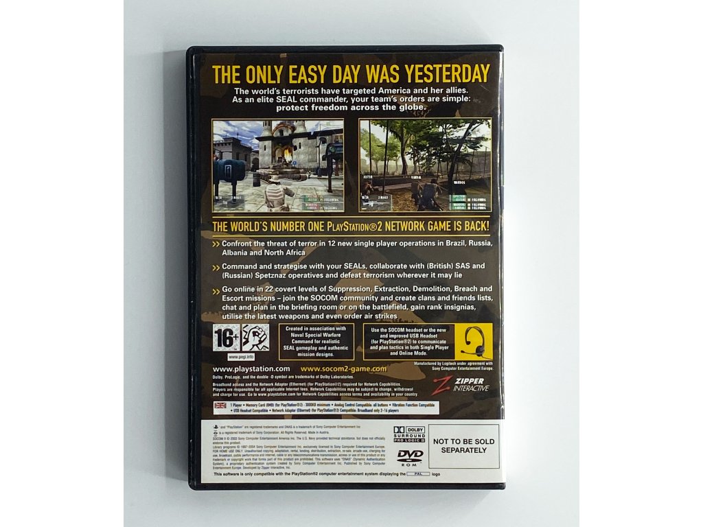 K dispozici je 22 skrytých úrovní v misích Suppression (Útlak), Extraction (Dobývání), Demolition (Ničení), Breach (Prolomení) a Escorta (Eskorta). SOCOM II je vynikající titul, budete nadšeni, až budete moci vytvářet strategické plány, získat různé odznaky hodností, používat nejnovější zbraně a dokonce nařídit vzdušné údery. Jste velitel a vaše družstvo vás bude následovat a opakovat vaše polohy těla (například pohyb kupředu a leh tváří k zemi budou všichni po vás kopírovat).