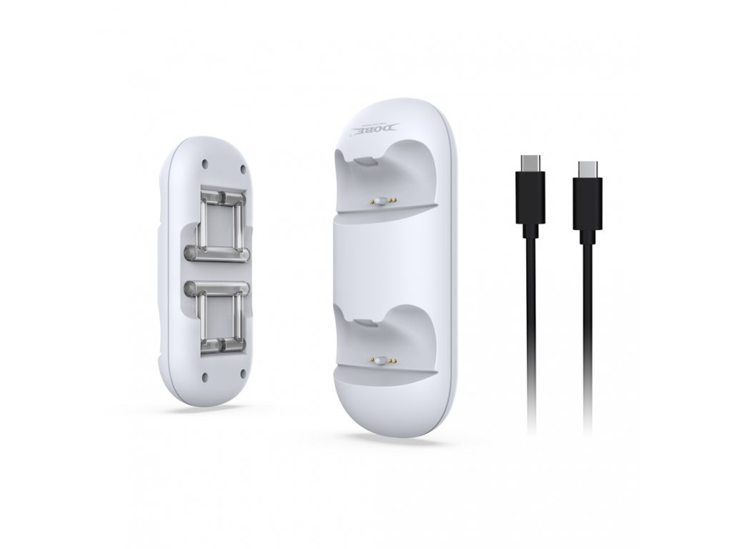 Nabíjacia stanica od spoločnosti DOBE - pre dva ovládače PlayStation 5, rozmery 133 x 60 mm, hmotnosť 59 gramov, skladacia základňa, vyrobená z kvalitného ABS plastu, vrátane prepäťovej ochrany.